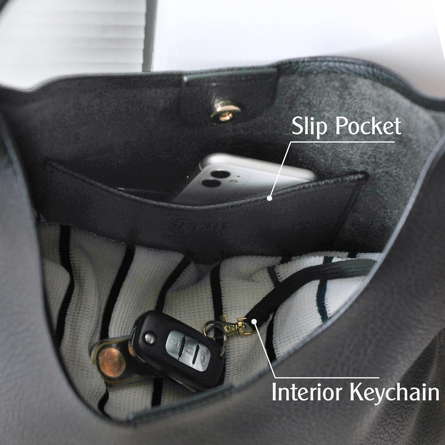 - - Despite its slouchy appearance, this tote surprises with its spacious interior. It features an interior pocket for organization, an interior D-ring for keeping your keys easily accessible, and a magnetic closure to prevent spills.